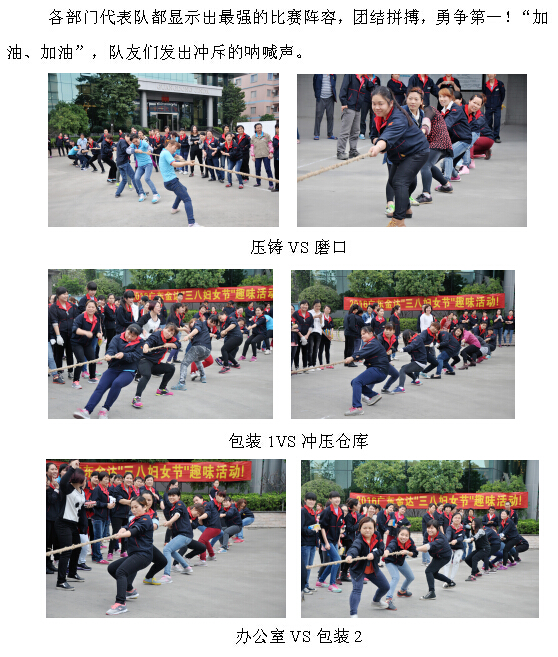 跟隨著現(xiàn)場歡快的音樂,大家放開了工作中忙碌的心情,積極參與各項活動,玩得不亦樂乎。其中的拔河項目比賽更為精彩,首先,上場的是經理隊與主任隊的友誼賽,在這里,我們見到了平時嚴威的領導們,也露出了燦爛的笑容。接著,由各部代表組成的6支隊伍; 包裝1隊、包裝2隊、壓鑄隊、沖壓倉庫隊、磨口隊、辦公室隊進行勝負對決。參賽的成員個個都精神抖擻,隊友們也在一旁加油吶喊?,F(xiàn)場的歡呼聲、吶喊聲,沖斥著整個活動氣氛,包裝2隊與壓鑄隊的實力更是旗鼓不讓,不相上下,場面相當激烈。最后,冠軍由現(xiàn)場人氣最強的包裝2隊取得。