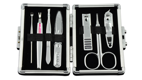 產(chǎn)品規(guī)格:110mm*71mm 包裝規(guī)格:120mm*90mm*30mm 材質(zhì):鋁材+420不銹鋼+碳鋼+鋅合金 配件:RM669指甲鉗、美容剪、斜口指甲鉗、指甲銼、耳挖、刮刀、死皮刀、眉夾
